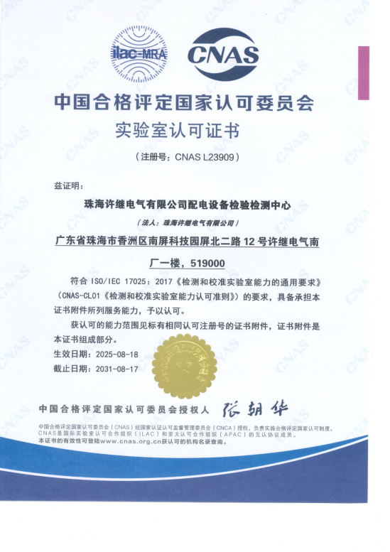 近日,许继电气所属珠海许继配电设备检验检测中心顺利通过中国合格评定国家认可委员会(CNAS)认可,获得CNAS认可标识和认可证书(注册号:CNAS L23909),标志着该中心在配电设备检验检测领域的技术能力、软硬件设施、质量管理体系及国际互认资质(方面)取得重大突破,检验检测水平获得国家权威认证。