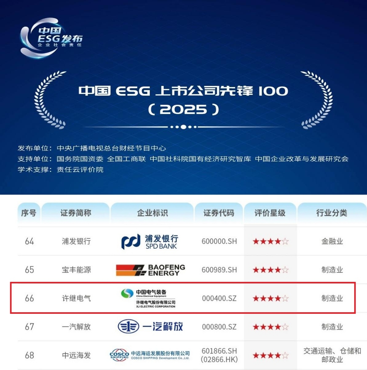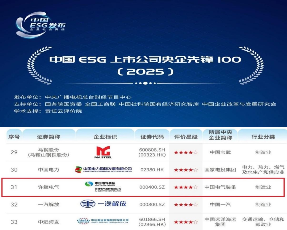 许继电气入选“中国ESG上市公司央企先锋100(2025)”榜单,位列第31位。