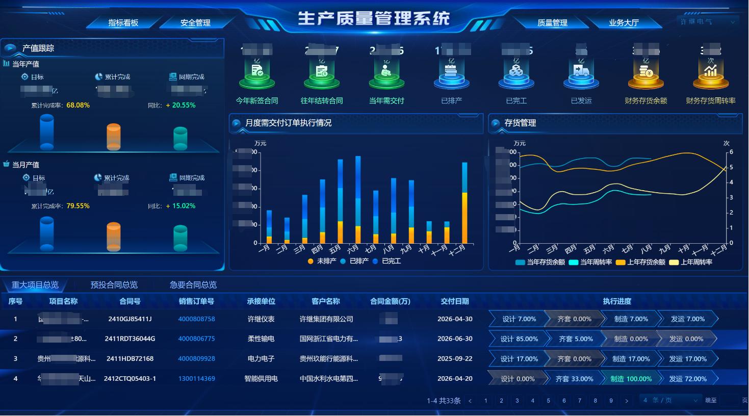 系统围绕电力装备行业交付周期长、按订单设计生产的痛点,打造了从签合同、研发设计,到采购物料、生产制造,再到成品发货、售后服务的全流程管理模式。