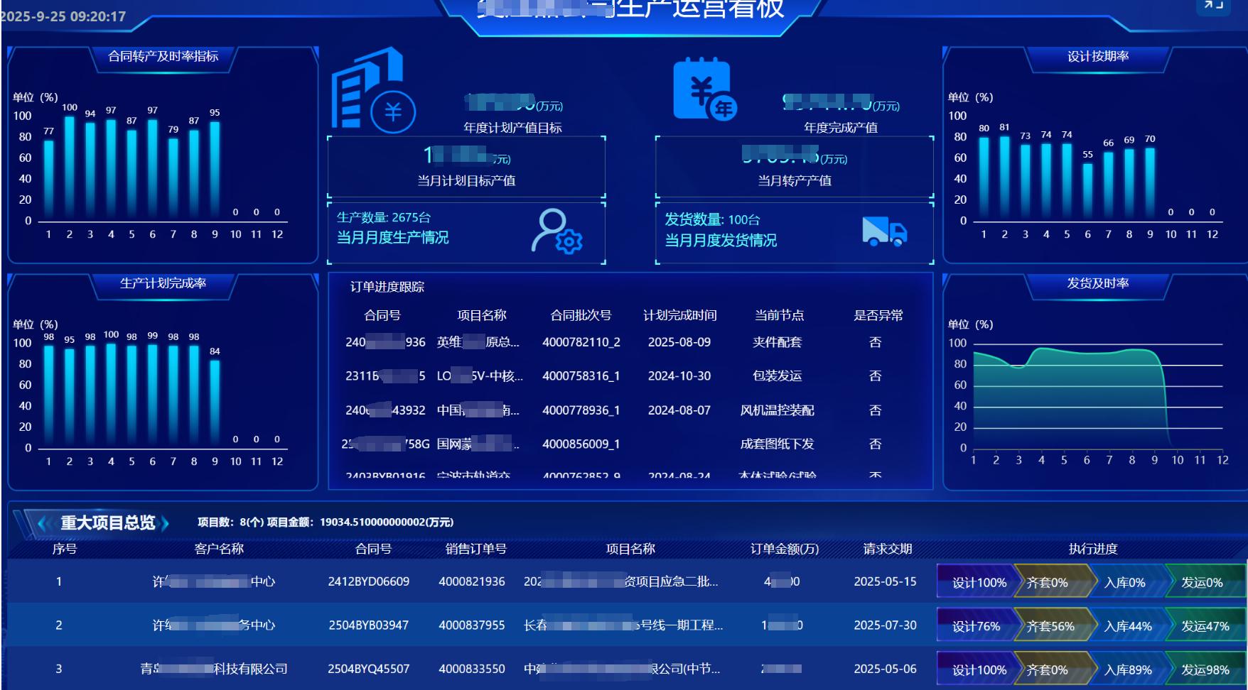 通过实时监控和直观数据展示,管理人员能随时掌握合同进度、库存情况、生产异常等核心信息,大幅缩短了市场响应时间;系统打通了设计和生产的数据壁垒,设计变更能快速同步到生产环节,传递时间从24小时缩短到2小时,解决了传统设计和生产脱节的问题。