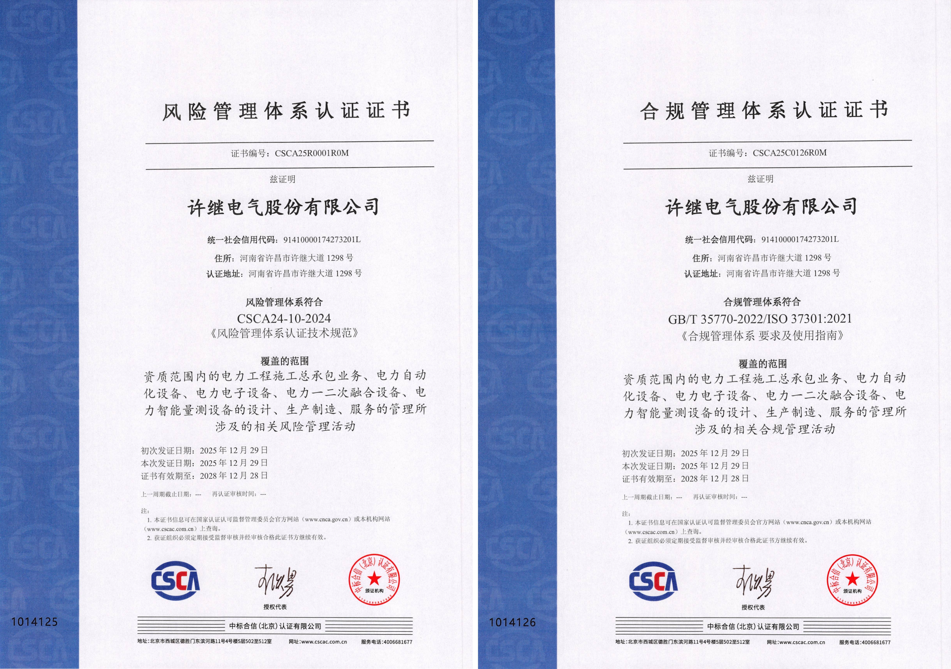 近日,许继电气成功通过ISO 37301:2021合规管理体系国际认证和基于国家认证认可行业标准CSCA24-10-2024的风险管理体系认证,是中国电气装备内部率先取得两项证书的企业。