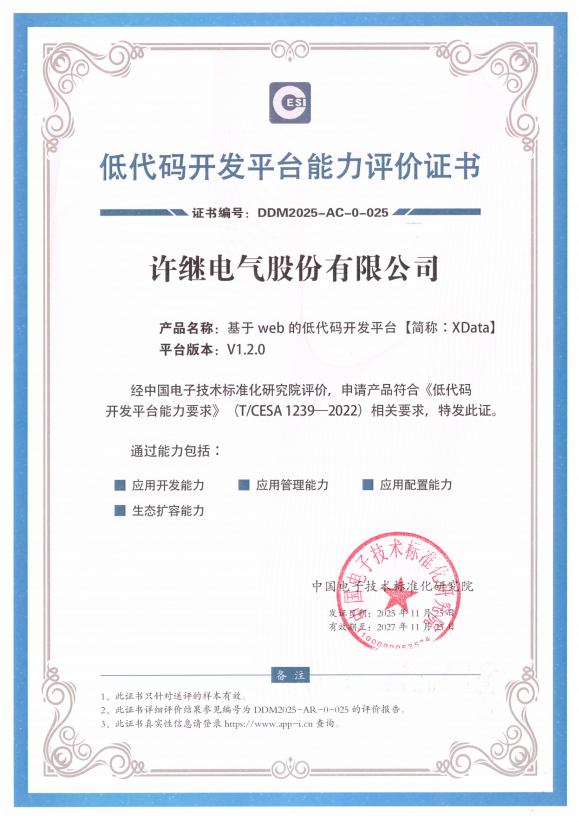 许继电气自主研发的“基于Web的低代码开发平台”通过中国电子技术标准化研究院权威测评,拿下相关能力评价证书,技术实力获官方认可。